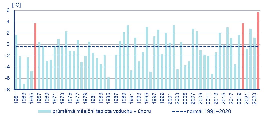 Dle předběžných dat byla průměrná teplota za únor (5,7 °C) o 6,1 °C vyšší než normál 1991–2020. Únor 2024 byl výrazně teplejší (o 2,0 °C) než doposud nejteplejší únor zaznamenaný v letech 1966 a 2020. Takto vysoká kladná odchylka od normálu nebyla dosud zaznamenána pro žádný měsíc v období od roku 1961. Dosud nejvyšší kladnou odchylku od normálu vykazoval leden 2007 (+4,5 °C od normálu 1991–2020, + 6,0 °C od normálu 1961–1990). Letošní únor tak byl dokonce teplejší než většina březnů, dle průměrné teploty by se zařadil jako 5. nejteplejší březen.