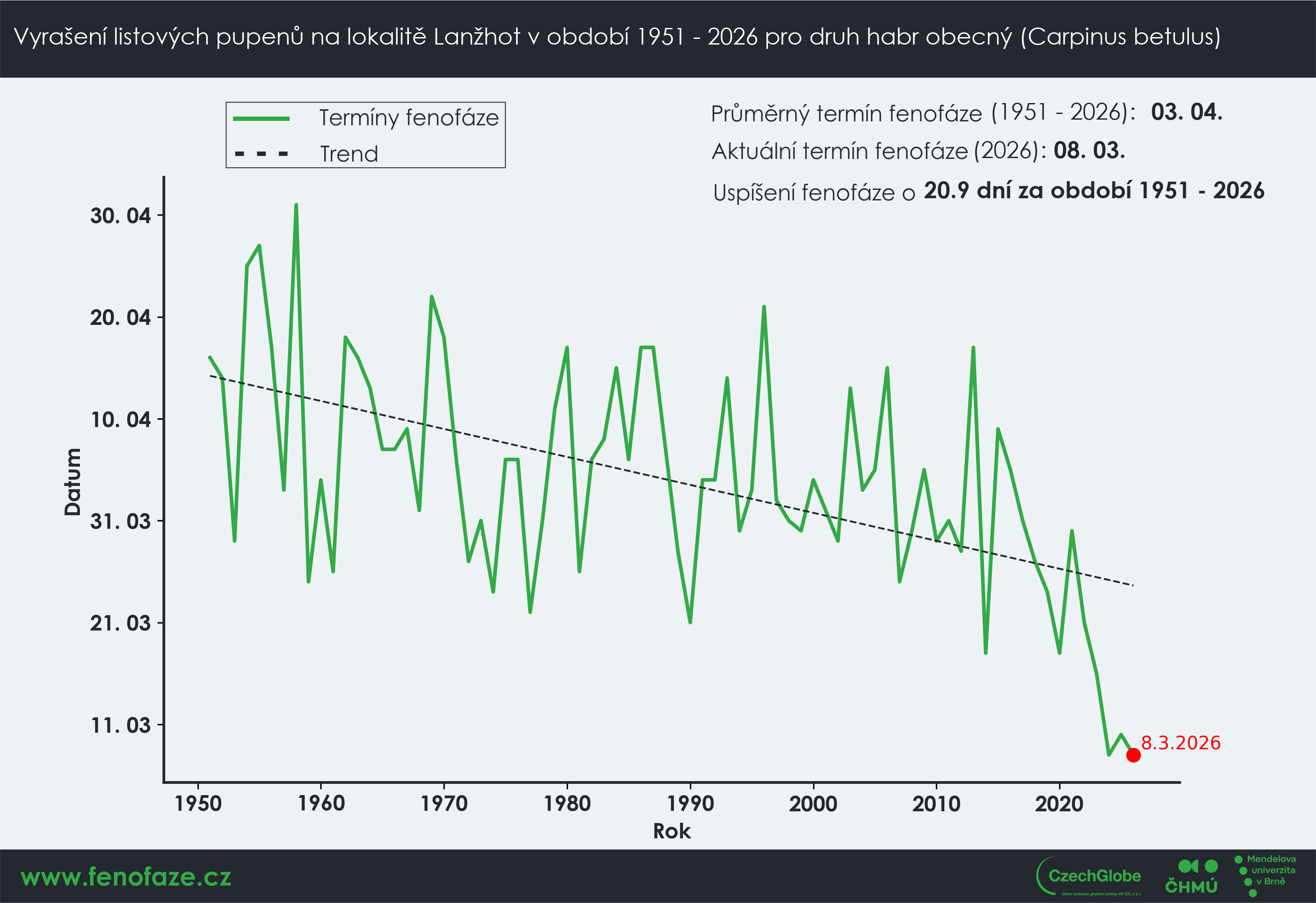 Letošní nástup jara je z hlediska reakce přírody opět velmi časný a potvrzuje trend nastolený v předcházejících třech letech. Jedná se již o čtvrtý rok v řadě, kdy habry obecné raší v první březnové dekádě března, přestože průměrný termín za období let 1951 až 2025 této vývojové (tzv. fenologické) fáze je na počátku dubna, konkrétně čtvrtého. Uvedla to na základě pozorování Lenka Bartošová z Ústavu výzkumu globální změny AV ČR – CzechGlobe a Mendelovy univerzity v Brně.